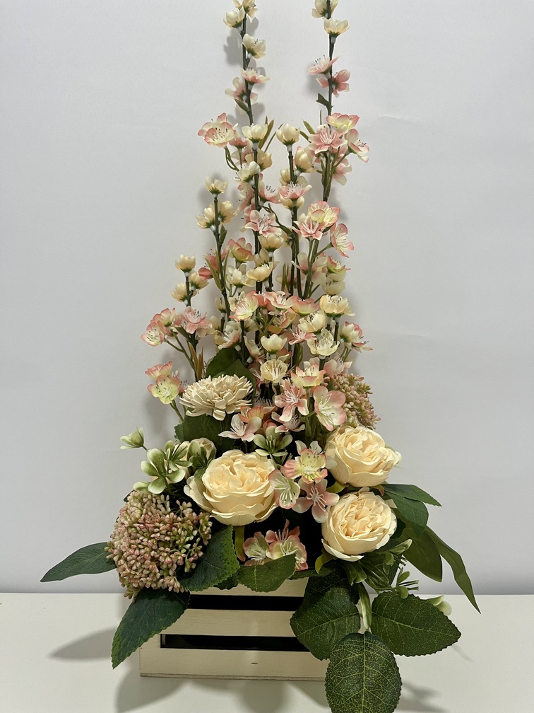 Centro de flor artificial en caja de madera en tonos salmon con varas de almendro y rosas crema. Dimensiones 56cm de alto x 30cm de ancho.