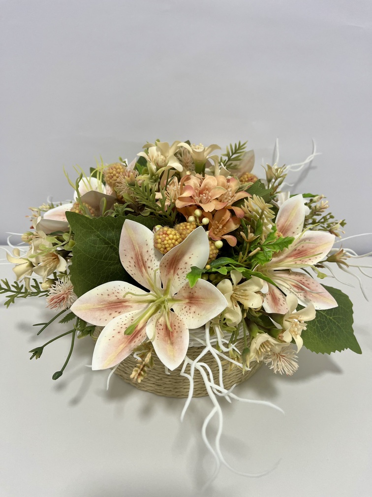 Centro de flor artificial en cesta de mimbre redonda, tono salmon con liliums, astromenias y relleno de bolitas. Dimensiones 16cm de alto x 30cm de ancho.