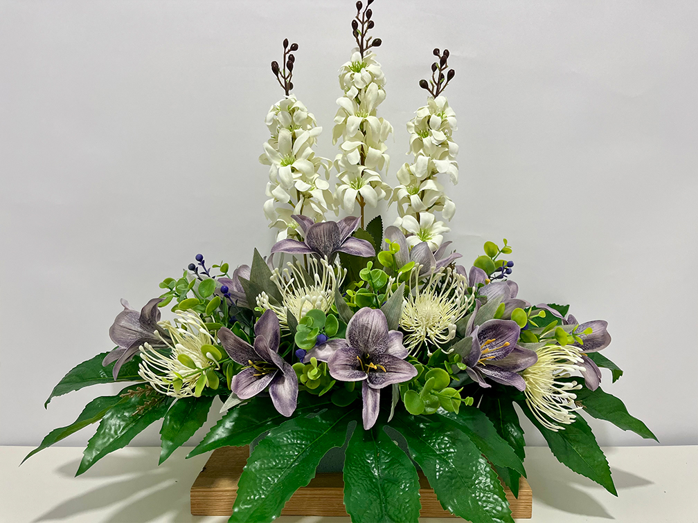 Jardinera lirios morados, delfinium blanco y cardos blancos, hojas de aralia. Dimensiones 45cm del alto x 55cm de ancho. No incluye recipiente.