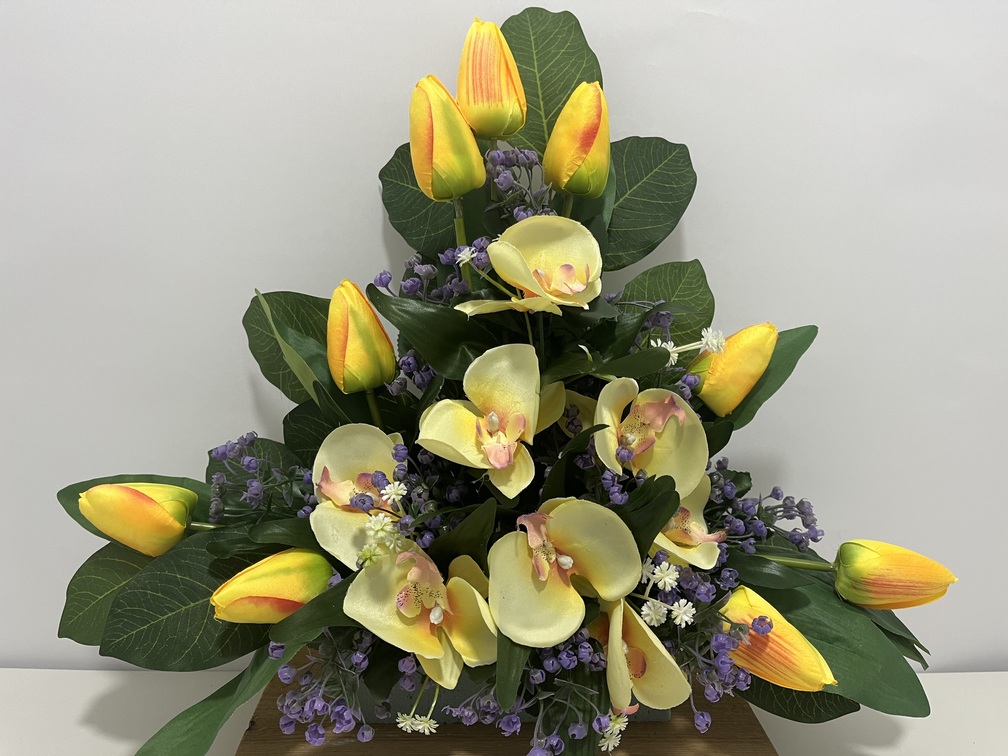 Jardinera tulipanes color amarillo, orquideas color amarillo y relleno paniculata morada. Dimensiones 42cm del alto x 45cm de ancho. No incluye recipiente.