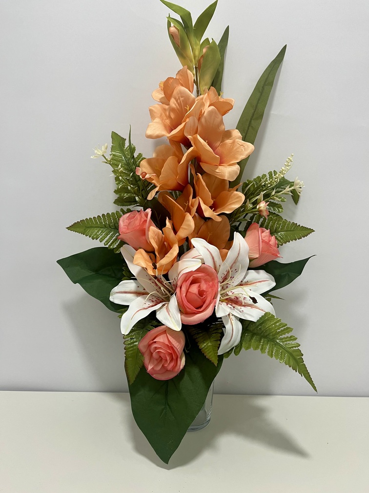Ramo flor artificial forma recta, con gladiolo y rosas salmon con lilium blanco. Dimensiones 47cm de alto x 35cm de ancho. No se incluye recipiente.