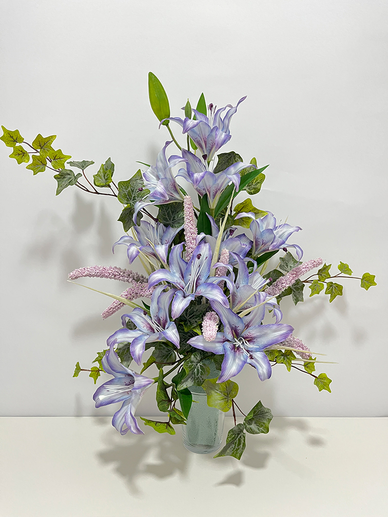 Ramo flor artificial, forma media luna, con luliums color lila como flor principal, juncos en rosa clarito y relleno de yedra verde mate. Dimensiones 60cm de alto x 30cm de ancho. No se incluye recipiente.