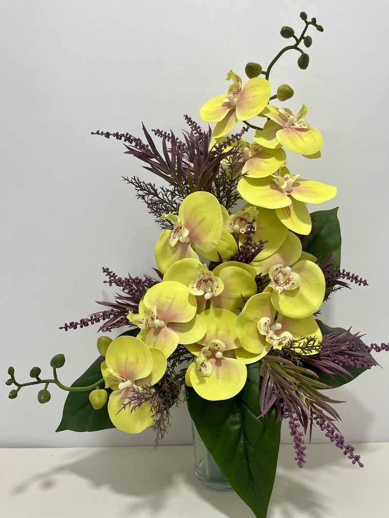 Ramo orquidea phalaenopsis tacto natural color amarillo, pincho silvestre morado, hojas de cala. Dimensiones 48cm de alto x 40cm de ancho. No incluye recipiente.