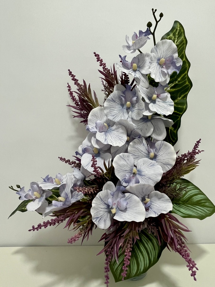 Ramo orquidea phalaenopsis tela color azul-lila, pincho silvestre morado, hojas bicolor. Dimensiones 56cm de alto x 48cm de ancho. No incluye recipiente.