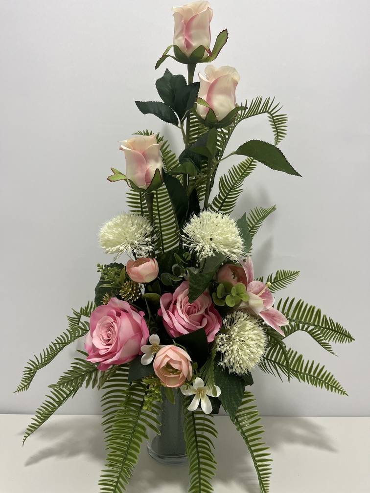 Ramo capullo de rosas color salmon, rosas abiertas en color rosa, cardos y lilium, hojas de helecho. Dimensiones 50cm de alto x 38cm de ancho. No incluye recipiente.